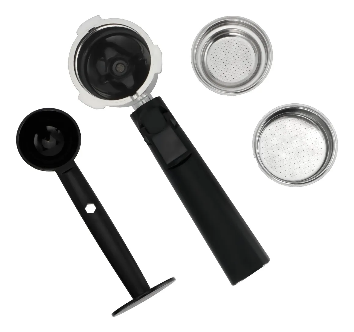 - Incluye: Porta filtro de aluminio, 2 filtros de acero inoxidable (para espresso simple y doble), y cuchara con pisón.
