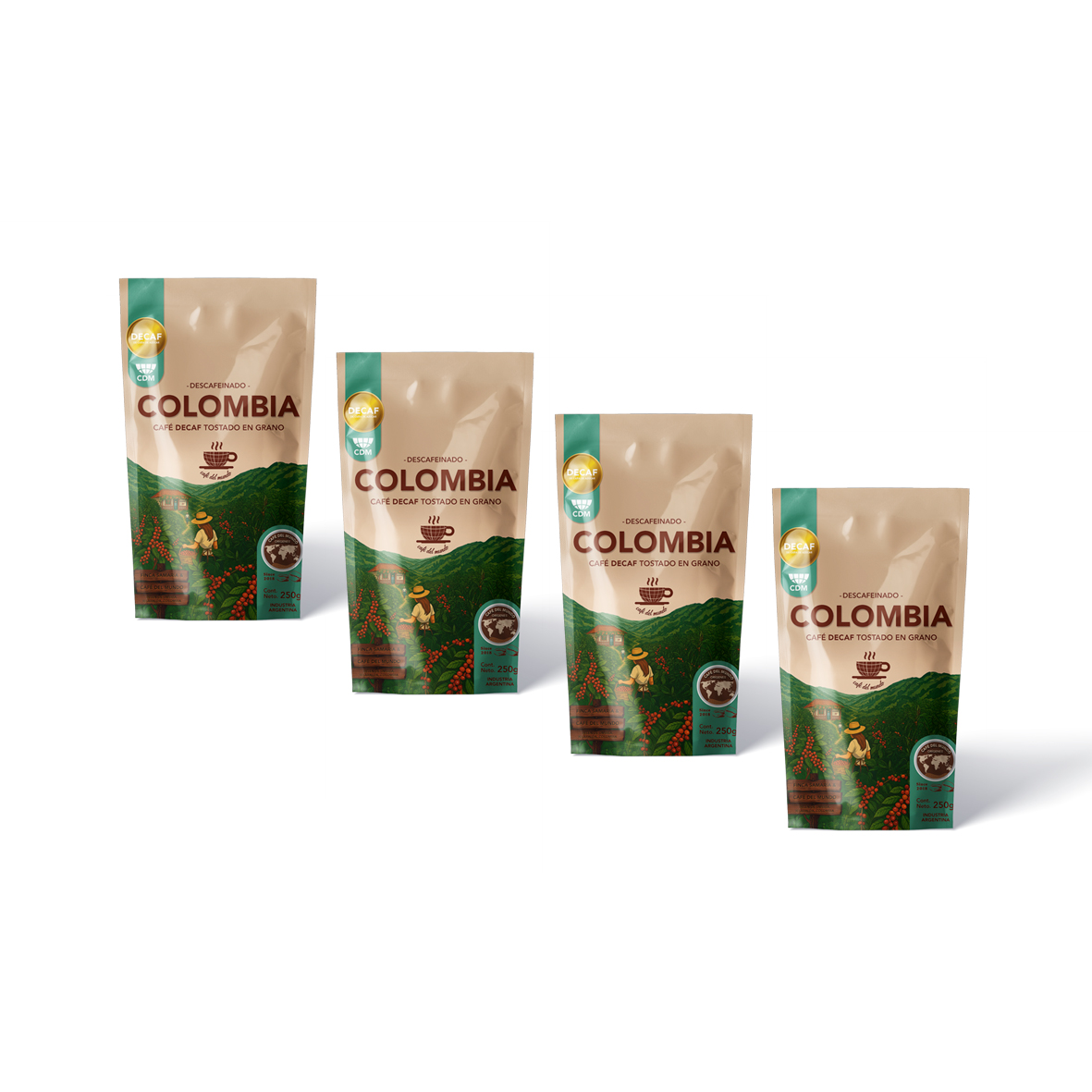 Café Descafeinado Colombia en Grano 1kg en un pack de 4 doypack x 250g, Café Del Mundo